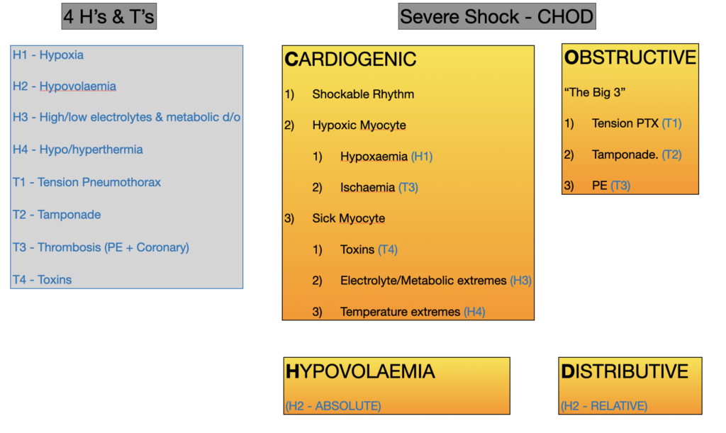 As a complementary approach to trying to remember an unfamiliar list of 8 items, considering that cardiac arrest is something most clinical staff rarely come across, it can be useful to view arrest as just a severe version of shock. Shock is far more commonly encountered by clinical staff, especially those working in hospitals, and conceptualising arrest in this way can be of dual educational and retention value. Shock is typically categorised in 4 groups provided by the acronym CHOD:
